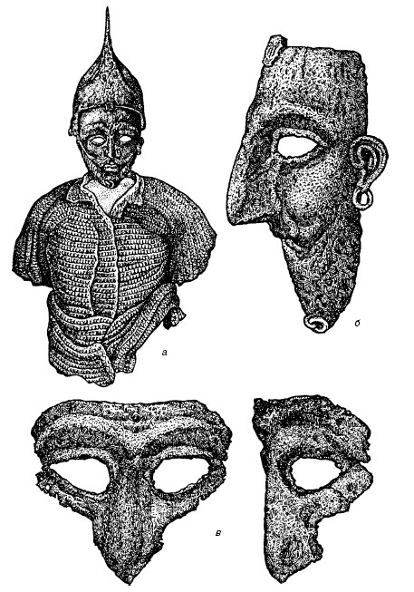 Железные маски XI–XIII вв.: а – железный шлем с маской и кольчугой из погребения у села Ковали Черкасской области; б – профиль маски у села Ковали; в – железная полумаска из села Вщиж Брянской области
