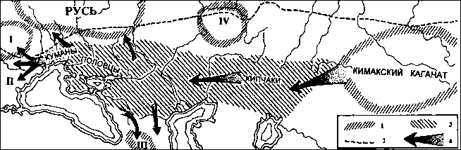 Схема расположения в степях кимаков, кыпчаков, половцев, куманов: / – Венгрия; II – Болгария; III – Грузия; IV – Волжская Болгария. 1,2 – северная граница степей; 3 – кочевнические общности; 4 – основные направления кочевнической экспансии в конце X–XIII вв.(По С.А. Плетневой)