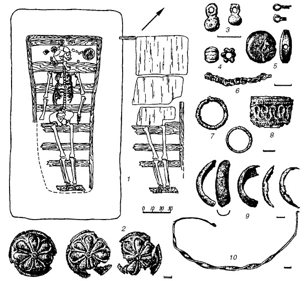 Половецкое погребение XII–XIII вв.: 1 – погребение с остатками гробовища; 2 – полусферические бляхи, плакированные золотом в виде семилепестковых розеток; 3 – бронзовые пуговицы; 4 – пастовая бусина; 3 – янтарная бусина; 6 – серебряная цепочка; 7 – серебряные колечки; 8 – бронзовая, плакированная золотом пластина; 9 – бронзовые, плакированным золотом дуговидные пластины; 10 – серебряная шейная гривна. Город Орджоникидзе Днепропетровской области