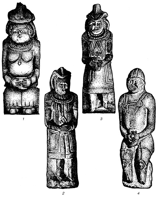 Половецкие статуи: 1 – Краснодарский край, станица Старая Леушковская. Краснодар. Краеведческий музей; 2 – Донецкая область, Артемовский район, село Ступки. Москва. Государственный исторический музей; 3 – Донецкая область, Артемовский район, село Скотоватое. Москва. Государственный исторический музей; 4 – Донецкая область, Артемовский район, село Ступки. Москва. Государственный исторический музей. Материал всех статуй – песчаник