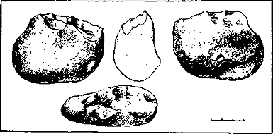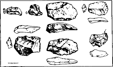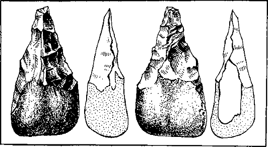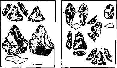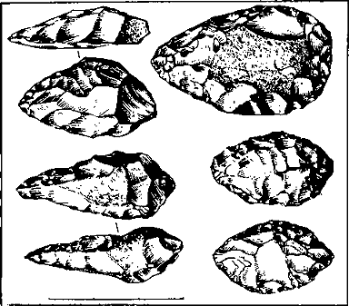 Все, на мой взгляд, объясняется довольно просто. В Северной Франции имеются характерные образования — жеоды кремня. Они очень причудливой формы, с округлыми отростками, покрытые белым налетом. Форма этих жеод обычно вытянутотреугольная. Она, очевидно, и натолкнула древних людей на идею сделать бифас. Оббитая со всех сторон жеода могла использоваться как орудие крупных размеров. Может быть, первые люди, достигшие Сены и Соммы, уже умели делать бифасы, а традиция изготовлять именно такие орудия была передана им их далекими предками — выходцами из Африки? Но тогда тем более вопрос решался просто — упомянутые жеоды как нельзя лучше соответствовали идее бифаса. Так или иначе, а первичный материал, его форма и качество, конечно же, играли очень важную роль в формообразовании каменных орудий.