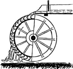 А если вода падает на лопатки где-то посредине колеса, — такое колесо именуется среднебойным. Наконец, если никак нельзя заставить воду падать сверху, ставят нижнебойное колесо вроде тех, которые применялись еще в древнем Вавилоне.