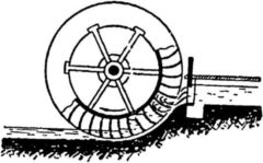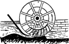 Колесо это было необычным: во все стороны от центра на одинаковых расстояниях торчали из обода лопатки. Внизу лопатки погружались в воду, и вода их увлекала течением. Передвигаясь по течению, эти лопатки поворачивали колесо и в воду опускались следующие лопатки. Так колесо вращалось.