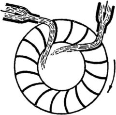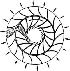 На рисунке показана схема лопастной реактивной турбины. Ее колесо имеет так же, как и колесо активной турбины, множество лопастей специальной формы. Вокруг колеса помещается неподвижный металлический пояс, направляющий аппарат, разделенный перегородками на каналы особой формы. Вода поступает сразу во все каналы кожуха (как показано стрелками) и движется вдоль каналов сразу на все лопасти колеса.
