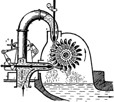Эта струя образуется оттого, что перед колесом вода пропускается через специальную направляющую трубу. Струя воды попадает на вогнутые лопасти, скользит вдоль них и сливается в центральную часть колеса. Такое колесо уже будет вращаться не потому, что падающая вода своей тяжестью (верхнебойное колесо) или текущая вода силой течения (нижнебойное колесо) увлекает за собой лопасти.