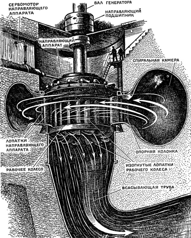 Реактивная гидротурбина с вертикальным валом. Вода поступает вначале в спиральную камеру, окружающую направляющий аппарат, и затем — через каналы между неподвижными лопатками направляющего аппарата на рабочее колесо турбины. Лопасти колеса имеют специальную форму, вода проходит по суживающимся каналам и сливается вдоль вертикальной оси вниз, во всасывающую трубу. Лопатки направляющего аппарата можно поворачивать с помощью специального механизма, который называется сервомотором. Этим суживаются или расширяются каналы направляющего аппарата и меняется количество воды, пропускаемое на рабочее колесо, а значит — и мощность турбины.