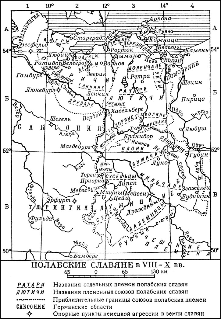 На этих территориях возникло несколько славянских племенных объединений. Наиболее мощными среди них были союзы ободритов[67] и вильцев (лютичей), каждый из которых, согласно Баварскому географу (середина IX в.), состоял из четырех племен. Союз вильцев-лютичей образовали кессины, жиржипане, толленсы (от озера Толлен) и редарии; в ободритский племенной союз входили вагры, полабы, собственно ободриты и варны (по названию реки Варнов). Каждое из этих племен управлялось своими вождями, имело своих богов и городища. В середине IX в. у вильцев насчитывалось 100 городищ, столько же имелось у ободритов. Скандинавы восхищенно называли славянское Поморье «Гарды», «Гардарики», то есть «страна городов». Так, «Сага об Инглингах» повествует о поездке бога Одина из легендарного Асгарда «сначала на запад в Гардарики, а затем на юг в Страну Саксов» (современная Саксония). Позднее название «Гарды» будет перенесено на Русскую землю.