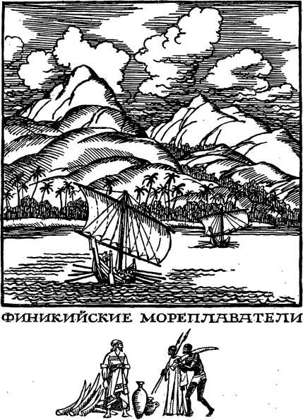 …Финикийцы жили когда-то на узенькой береговой полосе в северо-восточном углу Средиземного моря. Народ этот частью исчез, частью слился с другими народами. В глубокой древности маленькая страна эта процветала. Большую часть Финикии занимали горы. В горах Ливана росли великолепные кедры, дубы, кипарисы. Плодородной земли было мало, но финикийцы тщательно возделывали каждый клочок ее. Даже в предгорьях, на террасах, они сажали пшеницу, по больше всего было у них садов с финиковыми пальмами и оливковыми деревьями. Были у них и отличные виноградники, и финикийцы славились своим превосходным вином. Главным кормильцем финикиян было море; они ловили рыбу, сушили ее и сохраняли впрок. Море давало им также моллюсков, в раковинах которых содержалось немножко темной жидкости. Капля по капле собирали финикияне эту жидкость и варили из нее превосходную краску — красную, пурпуровую. Народ был предприимчивый, энергичный. Были они и замечательными мастерами-художниками; хороши были их чаши из драгоценного металла и разные безделушки из слоновой кости.