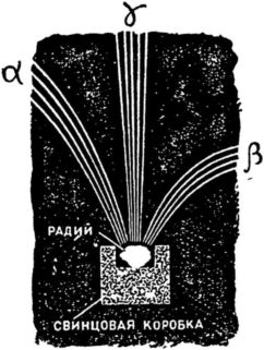 Открытие радия дало возможность ученым ответить на эти вопросы, — изучить природу и свойство новых лучей, так как теперь они излучались достаточно сильно. Вскоре было обнаружено любопытное свойство новых лучей. Если кусочек радия поместить в поле сильного электромагнита, то лучи, испускаемые радием, на фотопластинках оставляют три следа, как будто здесь три разных вида лучей. Первый пучок отклоняется немного влево, второй пучок направляется прямо, а третий пучок отходит резко вправо.