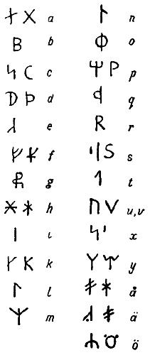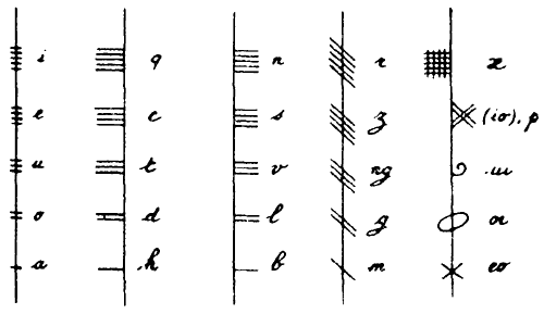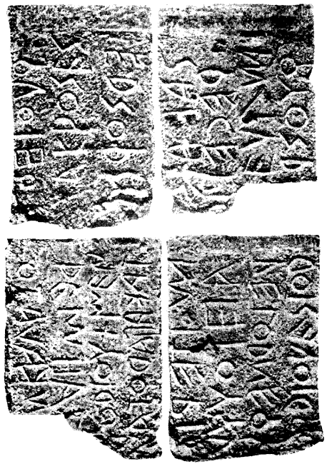 Замечательна форма знаков письма — насечки в виде линий и точек, нанесенные направо и налево от ребра камня. Алфавит состоит из 20 знаков. Письмо не является спонтанным изобретением, но оно тем более и не восточного происхождения, как полагают некоторые; это латинский алфавит, переписанный другими знаками, возможно — тайнопись священнослужителей, и наличие связей с германским руническим письмом весьма сомнительно.