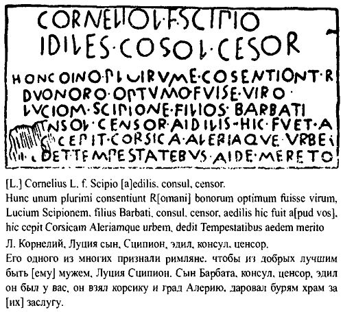 Рис. 196. Надгробная надпись Корнелия Сципиона, консула (259 г. до н. э.).