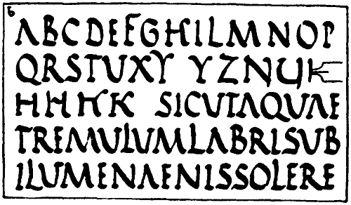 Латинский алфавит теперь принято считать разновидностью этрусского. Об этом говорит употребление С для g и для k, а также первоначально принятое употребление К перед а, r и в конце слова, С перед е и i, a Q — перед u, как в этрусском. Отсутствующие в собственно этрусском алфавите В, D, О, X заимствованы дополнительно, — как полагают, либо из греческого алфавита Южной Италии, либо из «прототирренского» письма. Это как будто свидетельствует о том, что заимствование письма римлянами произошло около 700 г. до н. э. Интересно употребление древнего F (v) для латинского f (но в древних надписях еще можно видеть FH (vh) в смысле f). Так как в латинском не было глухих смычных придыхательных th, kh, ph, то соответствующие знаки были римлянами опущены[27]. Буква Z стала лишней после того, как около 350 г. до н. э. древнее z (звонкое s) превратилось в латинском в r. Знак Z был упразднен, и греческая Z передавалась латинским S до той поры, пока во время Суллы (?) знак Z не был 1 вновь заимствован из греческого вместе с греческим Y = у (u); оба дополнительных знака были поставлены в конец алфавита. Обозначение звука k тремя буквами С, К и Q было упрощено таким образом, что звук k стал передаваться буквой С, перед u в строго определенных случаях остался q, а К употреблялся только в немногих словах перед а. Большое неудобство причиняло двойное употребление знака С (для обозначения g и k), что побудило изобрести для g новый знак G (ок. 230 г. до н. э.).