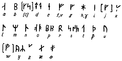 Правда, можно себе представить, вместе с Г. Йенсеном, что у древних германцев было примитивное письмо со смысловыми знаками (идеограммами), употреблявшееся ими не для передачи сообщений, а в магических целях. Это как будто подтверждают часто цитируемые слова Тацита (Germania, 10), что германцы получали у оракула палочки с нанесенными знаками и по ним пророчествовали. Но это остается более или менее предположительным. Во всяком случае, рунический алфавит подлинных германских надписей начала нашей эры проявляет несомненное родство с южными алфавитами.