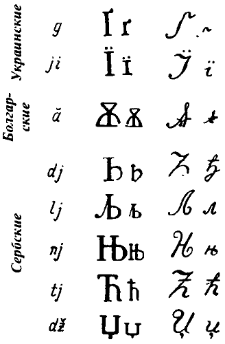 Рис. 210. Украинские, болгарские и сербские дополнительные буквы.