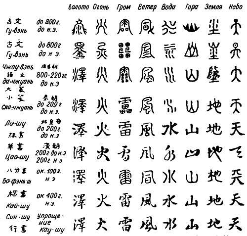 Естественно, что и здесь с течением времени изменился графический облик знаков. Древнейшие надписи на гадательных костях и бронзовых сосудах (XV–XII вв. до н. э.) выполнены так называемым древним письмом (гу-вэнь), оно еще довольно тщательно передает изображения предметов и допускает варьирование формы знаков. В дальнейшем развивается и нормализуется чжоу-вэнь, или да-чжуань («большая печать», «большое письмо для печатей», около 800–200 гг. до н. э.), а также сяо-чжуань («малая печать», «малое письмо для печатей», около 200 г. до н. э.). После изобретения кисточки появляется ли-шу, т. е. «официальное письмо», а около 400 г. н. э. за ним следует кай-шу — «уставное письмо», которое и доныне осталось основным и наиболее распространенным видом письма и не претерпело более или менее существенных изменений даже в связи с изобретением книгопечатания. Наряду с ним в постоянном письменном общении употребительны курсивы: тщательно отделанный и легко читаемый курсивный шрифт син-шу («беглый шрифт») и очень беглый и трудно читаемый цао-шу («травяной шрифт»).