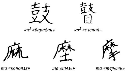 Значительно чаще встречаются более сложные случаи, когда звуковой заменитель этого рода связывается еще и со смысловым детерминативом, или в китайских терминах с так называемым главой класса: знак для ku3 «барабан» употребляется также и для ku3 «слепой», но с детерминативом «глаз», указывающим, что подразумевается ku3, связанное со зрением, а именно «слепой». Соответственно ma «конопля» ставится в случае ma «тереть» с детерминативом «рука» и для ma «пыль» — с детерминативом «земля», или hwa «цветок» — с детерминативом «лошадь» для выражения hwa «пегий конь», с детерминативом «говорить» — для hwa «кричать»; huang3 «царственный» с детерминативом «огонь» — для huang3 «блестящий». Последний пример показывает, что при этом допускаются и неточности в обозначении тонов, подобно тому как в шумерском ti «стрела» не вполне точно покрывает звуковой состав слова ti(l) «жить».