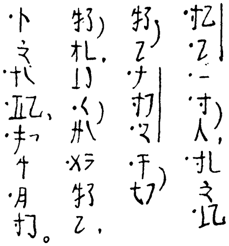 t’ien2 «небо» — японское окончание — te и т. д. Так из китайских знаков возникло японское слоговое письмо катакана, изобретенное, согласно преданию, министром Киби (но) Макиби около 750 г. Письмо катакана уже засвидетельствовано очень древними японскими литературными памятниками; его внешняя сторона окончательно сформировалась в эпоху Камакура (1185–1333 гг.). В некоторых случаях произношение слоговых знаков взято не от китайского, а от японского слова: яп.