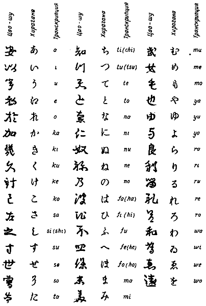 Таблицы на рис. 10 и 217 показывают 47 слоговых знаков и их древнеяпонское произношение. Звонкие согласные b, d, g, z, dz рассматриваются как модификации глухих f, t, k, s, ts и отличаются от них благодаря добавлению значка нигори