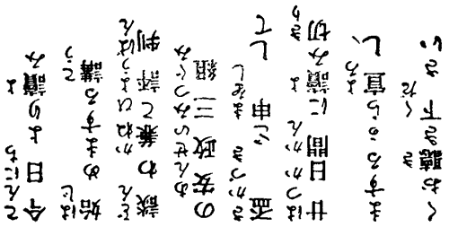 После этих предварительных данных о сущности японского письма следует подробнее остановиться на процессе его исторического развития. Много споров вызывал вопрос, существовало ли в Японии собственное письмо до введения китайского; скорее всего, на этот вопрос следует ответить отрицательно. Существование упоминаемых в японской литературе так называемых знаков эры богов[28] исторически сомнительно, тем более, что не сохранилось ни одного памятника.