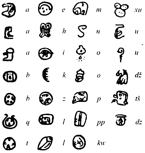 Исходя только из внешнего вида, можно отнести тщательно выписанные знаки письма с их закругленными и лишь отчасти сохранившими рисуночный характер формами к типу словесного письма. Отдельные элементы сложных знаков большей частью заключены все вместе в квадрат или овал, что в известной степени сопоставимо с китайским письмом. О характере отдельных знаков еще нельзя высказаться наверняка, так как дешифровка письменности майя еще никоим образом не может считаться законченной, хотя епископ завоеванного испанцами Юкатана Диего де Ланда в своей книге «Сообщение о делах в Юкатане» (1566) привел знаки, обозначающие 18 месяцев календаря майя и 20 дней каждого месяца, а также их названия. Кроме того, установлены система счисления, некоторые обозначения имен богов и т. п. Но приведенный Ландой гипотетический алфавит майя, состоящий из 27 знаков, по всей вероятности, является искусственным, и притом созданным испанцами.
