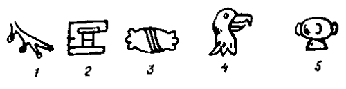 Рис. 223. Ацтекские рисуночные словесные знаки для передачи конкретных понятий: 1 — Вода; 2 — дом; 3 — камень; 4 — ястреб; 5 — глиняный сосуд.