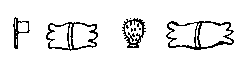 Упомянутый выше способ написания имен показывает, что у ацтеков наряду с идеографическим письмом существовали уже и отдельные словесные знаки. Конкретные предметы можно было обозначать, просто-напросто изображая их. Абстрактные предметы изображались символически, «смерть» — как череп, «овдоветь» — как плачущий глаз. Если была необходимость изобразить имя точнее, нежели это возможно с помощью тотемического знака над головой, ацтеки прибегали к звуковому ребусу и обозначали, например, название местности Teocaltitlan, что значит «место дома бога», с помощью рисунка губы (на языке ацтеков ten-tli) для слога te, дороги (o-tli «следы») для слога о, дома (cal-li) для слога cal и зуба (tlan-tli) для tlan, а слог ti оставался без обозначения. А для того, чтобы изобразить название местности Quauhnauac, рисовали дерево (quauh-tli) и рот с языком (naua-tl «речь»). Как можно заметить, звуковое соответствие изображаемого и подразумеваемого весьма неточно. К моменту открытия письменности ацтеков она находилась примерно на том же уровне, что и египетское письмо на своем начальном этапе: идеографическое письмо, смешанное с отдельными словесными знаками, среди которых заметную роль играют звуковые ребусы. Дальнейшему развитию воспрепятствовало уничтожение цивилизации ацтеков. Начала своего рода слогового письма засвидетельствованы в отрывочных фрагментах записи молитвы «Отче наш», первое слово которой показано на рис. 384. Первый знак pami-tl «флаг» обозначает слог ра (по-латыни молитва начинается со слов Pater noster), второй знак te-tl «камень» обозначает слог te, третий знак no?-tli «чертополох» — слог noc, затем снова следует знак no? «камень». Четыре знака читаются как pa-te noc-te, что является приблизительным соответствием pater noster. Конечно, на создании такого слогового письма сказалось испанское влияние.