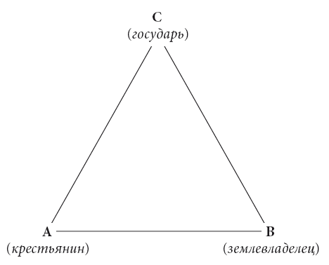 А и В принадлежат к разным классам общества. Эксплуатируемый А отягощен трудовыми обязательствами (рентой) по отношению к В и налоговыми обязательствами по отношению к С. Линия АВ является основанием треугольника, отражая главный признак феодального способа производства. Линия АС – это отношения между государством и непривилегированным подданным, который, не будучи защищен иммунитетом, должен платить налог государству и быть подсудным государственным органам власти. Линия ВС представляет отношения между государством и привилегированным подданным, за которым закрепляется в определенном объеме власть над населением его владения. Здесь устанавливаются границы полномочий В и С в делах, касающихся сбора налогов и пошлин, суда.