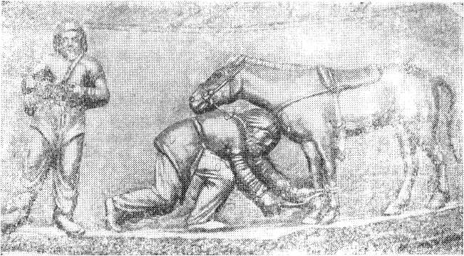 Скиф, стреноживающий коня. Часть фриза вазы, найденной Забелиным в Чертомлыкском кургане близ Никополя. Никопольская ваза хранится в Эрмитаже.