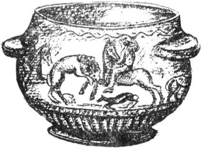 Курган Чертомлык, уже не раз нами упомянутый, раскопан известным русским археологом Забелиным около города Никополя в шестидесятых годах прошлого столетия. В этом кургане были две царские могилы, из которых одна была частично ограблена современниками покойника. Ограбление совершалось через узкие подземные проходы — мины, так как раскопать громадный курган было слишком сложно. Чертомлыкский курган в 20 метров высоты и в 350 метров окружностью. Требовалось большое количество людей и дней, чтобы при помощи еще деревянных лопат воздвигнуть такой курган. Грабители, очистившие одну из могил, попали под обвал при прохождении ими на обратном пути могилы. Один из грабителей так и найден в этой мине и при нем много золотых вещей. В уцелевшей могиле лежал царь, рядом, в особой могиле, лежали царица, 6 рабов и 11 коней. Об известном амфоровидном серебряном сосуде, с изображением в центре цветов, птиц, сверху — укрощения лошадей, уже говорилось при описании скифского коневодства. Имеются в Чертомлыке и чисто греческие золотые вещи с изображениями сюжетов из греческой мифологии.