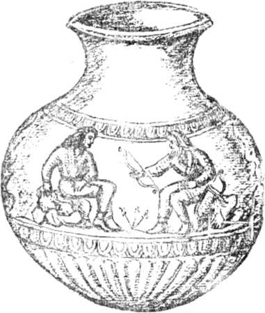 Электроновая вазочка из Обского кургана под Керчью. Хранится в Ленинградском Эрмитаже. Изображен скиф, перевязывающий ногу раненому товарищу.