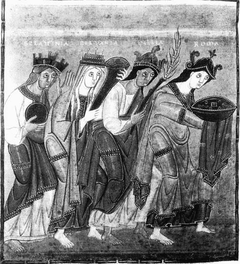 Translatio imperii», т. е. переход имперского господства от императоров античного Рима к Карлу Великому и его восточно-франкским наследникам, проиллюстрирован здесь весьма впечатляюще. Отгон III, исполненный величия, восседает с атрибутами государственной власти на императорском троне, Двое епископов и два герцога — по обе стороны от трона — символизируют имперскую знать и имперскую церковь. К трону смиренно приближаются четыре женщины, чтобы присягнуть на верность императору. В соответствии с позднеантичной традицией — это страны, подчиненные императору, — Рим, Галлия, Германия, страна славян (Склавия).