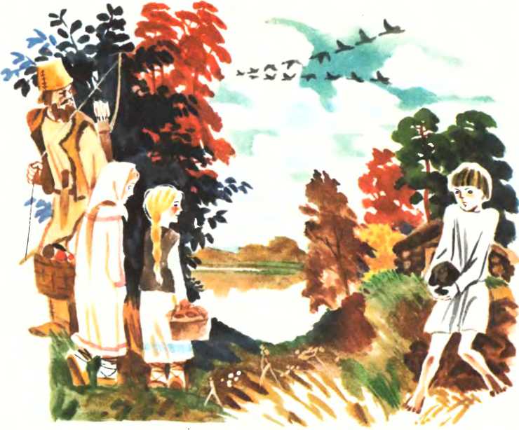 И пошла работа от восхода и до заката солнца. Лишь самые малые дети играли и в Клязьме-реке купались. А взрослые и ребята постарше копали землянки, крепили их стены жердями, крыши ветками настилали, а поверх землю насыпали. Посреди каждой землянки ямку выкапывали — для очага. Придёт зима, на очаге будут пищу готовить. И тепло сбережётся.