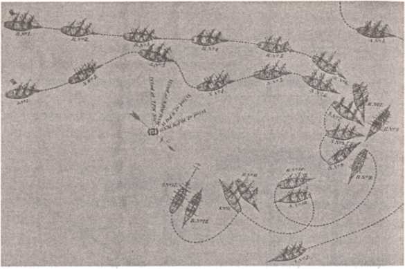 Схема боя «Добряка Ричарда» (R) с 50-пушечным английским фрегатом «Серапис» (S) у мыса Фламбург