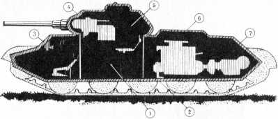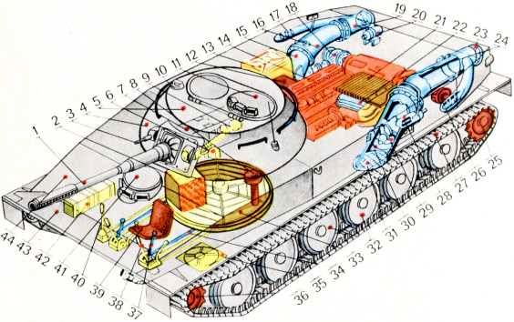 1 — ствол пушки; 2 — боеукладка (снаряды к пушке); 3 — пулемет; 4 — башня танка; 5 — крыша башни; 6 — контроллер электропривода поворота башни; 7 — казенная часть пушки; 8 — сиденье командира танка; 9 — телескопический прицел; 10 — перископический прибор наблюдения заряжающего; 11 — командирская башенка; 12 — масляный бак; 13 — топливный бак; 14 — двигатель; 15 — водяной насос; 16 — водяная труба; 17 — труба заднего хода; 18 — редуктор привода водяного насоса; 19 — кормовой патрубок водомерного движителя; 20 — привод заслонки кормового патрубка; 21 — масляный радиатор; 22 — водяной радиатор; 23 — заслонка кормового патрубка; 24 — коробка передач; 25 — ведущее колесо гусеничного движителя; 26—бортовой фрикцион; 27— гусеница; 28 — картер привода рабочего колеса водяного насоса; 29 — рабочее колесо насоса; 30 — приемный патрубок водометного движителя; 31 — входная решетка приемного патрубка; 32 — катки; 33 — вращающийся пол боевого отделения танка; 35 — люк запасного выхода; 36 — направляющее колесо; 37 — рычаг управления заслонкой водометного движителя; 38 — рычаг управления фрикционом и тормозом; 39 — сиденье механика-водителя; 40 — рычаг переключения скоростей.