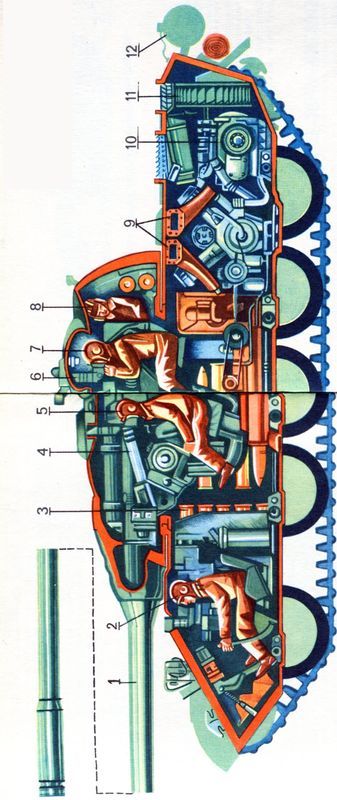 1. Ствол пушки. 2. Механик-водитель. 3. Боеукладка. 4. Прицел пушки. 5. Наводчик. 6. Перископ. 7. Командир танка. 8. Заряжающий. 9. Воздухозаборные трубы. 10. Трансмиссионное отделение. 11. Вентилятор. 12. Дымовая шашка.