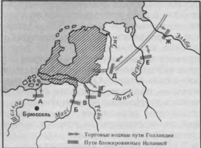 II. Важность сухопутной торговли для Соединенных Провинций Подлинной угрозой для страны было оказаться отрезанными от водных путей, которые их соединяли в торговом отношении с испанскими Нидерландами и с Германией. О важности этой связи свидетельствуют доходы таможен, находившихся под испанским контролем: 300 тыс. экю за год. Рядом с названием каждого города указана выплаченная им сумма (в тыс. экю). (См.: Alcala-Zamora. Espa?a… 1975, p. 184.)