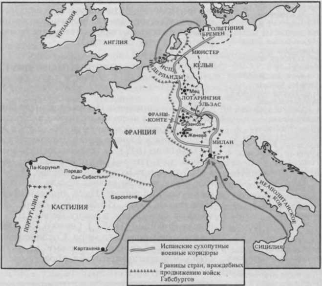 IV. Суша против моря Будучи затруднена на море, война для испанцев зависела от системы снабжения, которая, опираясь на Сицилию, Неаполь, Миланскую область, Франш-Конте, испанские Нидерланды и пользуясь многочисленными случаями потворства или нейтралитета в немецких землях, смогла создать постоянные транспортные коридоры через Альпы до самого Северного моря. На карте этот испанский [снабженческий] маршрут продлен до Голштинии, зоны набора солдат для нидерландской армии. (По данным Дж. Паркера: Parker G. Op. cit., p. 90.)