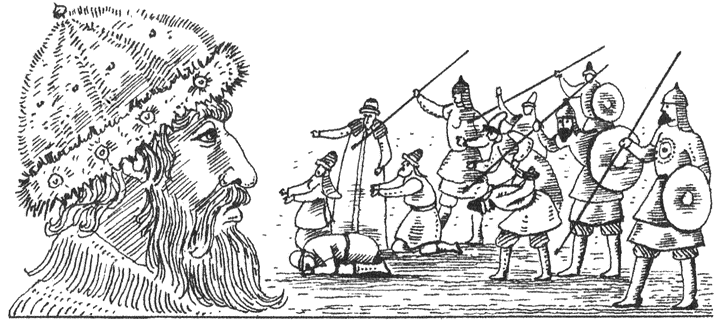 Тиран велит привести кобылу и обращается к епископу: «Получи вот эту жену, влезай на нее сейчас, оседлай и отправляйся в Московию и запиши свое имя в списке скоморохов». Далее, когда тот взобрался на кобылу, тиран велит привязать ноги сидевшего к спине скотины и, удалив его таким образом из города и прогнав с епископства, велит ему отправляться по назначенной дороге. И когда тот уже удалился, он опять велит позвать его к себе и дает ему взять в руки музыкальный инструмент, мехи и лиру со струнами. «Упражняйся в этом искусстве, — сказал тиран. — Тебе ведь не остается делать ничего другого, в особенности после того, как ты взял жену». И вот этот епископ, не умевший до того играть на лире, верхом на кобыле по приказу тирана удалился в Москву, бряцая на лире и надувая мехи.