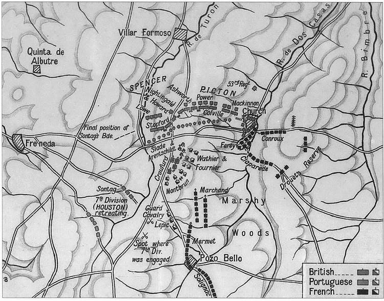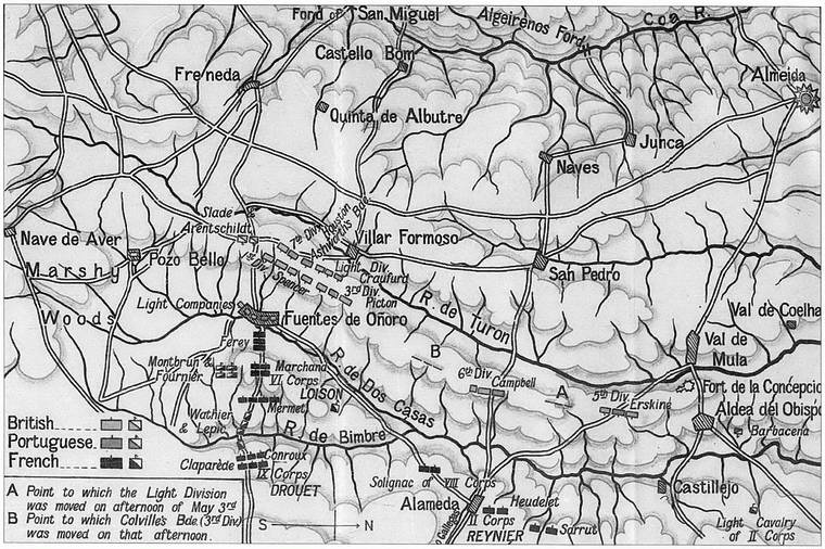Англо-португальская армия осадила крепость Альмейда, все еще занятую французским отрядом под командованием генерала Бренье (для этого Веллингтон выделил отдельную португальскую бригаду Дениса Пэка), а 3–5 мая встретилась с основными силами французов в сражении при Фуэнтес де Оньоро небольшом городке в провинции Саламанка на самой границе Испании и Португалии. Название этого населенного пункта произносится именно как Фуэнтес де Оньоро, а не как Фуентес де-Оноро или Фуэнтес д'Оньоро, как пишут многие авторы.