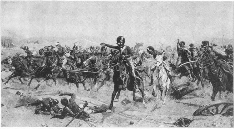 В это время на широкой равнине на западе от Посо Вельо кавалерия Монбрёна атаковала остатки британской кавалерии генерала Стэплтона Коттона. Конные егеря и гусары бригад Фурнье и Ватье перемешались с британскими драгунами и гусарами Королевского Германского Легиона. Вся равнина представляла собой сплошное облако дыма и пыли, в котором тысячами искр вспыхивал блеск касок и сабель. Используя свой численный перевес, французы опрокинули драгун генерала Слэйда. Португальская бригада из дивизии Хьюстона, находившаяся поблизости, встала в каре. Как отмечал Ж. Лявис, «ситуация для Веллингтона стала критической». (57)