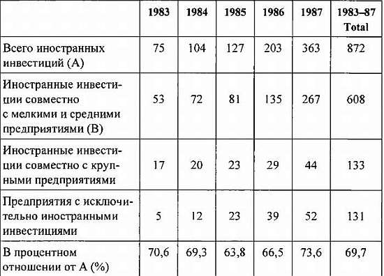 Чем больше средние и мелкие предприятия работали на экспорт, тем сильнее возрастала их зависимость от крупных предприятий как субподрядчиков, поставщиков и пр., и тем больше они попадали в зависимость от иностранного капитала в отношении средств производства и рынков сбыта. Особенно велика была зависимость от США и Японии. Доля используемого ими импортного сырья и материалов продолжала увеличиваться, как и совместные капиталовложения и импорт технологий. Как показывает Таблица 17, в 1983 г. имели место 53 случая совместных инвестиций, в которых участвовали южнокорейские мелкие и средние предприятия, с одной стороны, и иностранный капитал, — с другой. В 1987 г. это число увеличилось до 267. Число внедрений иностранных технологий также увеличилось: с 95 в 1982 г. (30,8 %) до 325 — в 1987 г. (51,0 %).