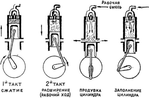 Пусть через верхние клапаны всё время поступает свежий заряд рабочей смеси, а внизу цилиндра пусть будут вырезаны окна, через которые уйдут отработавшие газы. Тогда первым тактом, когда поршень пойдет вверх, он своим телом закроет нижние окна, и, если в цилиндре есть свежий заряд, он его сожмет. К концу первого такта (сжатия) в цилиндр будет подана электрическая искра, — произойдет вспышка и поршень пойдет вниз, совершая второй такт — расширение, рабочий ход. Но поршень в конце хода вниз откроет окна, и отработавшие газы устремятся через окна наружу. При этом специальным механизмом откроются также и клапаны в крышке, через которые особым насосом будет нагнетаться свежая рабочая смесь. За время, пока окна остаются открытыми, свежий поток газа должен успеть вытеснить отработавшие газы — «продуть» цилиндр. Затем, когда поршень, возвращаясь к верхней мертвой точке, вновь перекроет выхлопные окна, свежая рабочая смесь поступит через клапаны в цилиндр, заполнит его объем, зарядив для очередного сжатия.