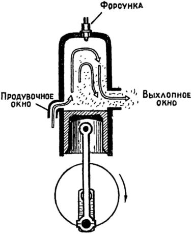При этих способах в крышке цилиндра нет клапанов, но зато в нижней части цилиндра имеется два ряда окон. Левую полуокружность занимают, например, продувочные окна, а правую — выхлопные. Выхлопные немного повыше; поэтому, опускаясь вниз, поршень сначала откроет эти окна, и отработавшие газы вырвутся наружу, а потом, когда поршень откроет и продувочные окна, в цилиндр через них начнет поступать нагнетаемый особой воздуходувкой воздух, который, обходя цилиндр «петлей», вытеснит через всё еще открытые выхлопные окна остаток отработавших газов. К концу продувки цилиндр окажется заполненным чистым воздухом, и поршень, поднимаясь вверх, перекрывая сначала продувочные, а затем и выхлопные окна, начнет сжатие свежего заряда.