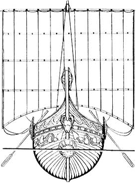 На каменных надгробиях древних захоронений в центральной части Италии (IV век до н. э.) изображены суда этрусков. Напоминая формой древние суда финикийцев, эти корабли отличались более крупным изгибом штевней и имели много общего с более поздними судами североевропейских народов. Как и на судах викингов, весла проходили через отверстия в бортах, чем обеспечивались удобное (низкое) положение гребцов и их защита высоким бортом. Зазоры между веслом и бортом закрывались короткими кожаными рукавами. Управлялось судно одним рулевым веслом с поперечным румпелем[14], закрепленным снаружи корпуса на правом борту. Мачта, устанавливаемая в средней части, несла прямой парус с одним реем. По верхним поясам обшивки проходил орнамент в виде стилизованного изображения волны. Обшивка корпуса имела украшения с изображением листьев. Ахтерштевень с навешенными по обеим сторонам щитами завершался украшением в виде рыбьего хвоста. Такие же щиты крепились в верхней части форштевня и по всему борту. В носовой части судна устанавливался проемболон в виде головы барана — конструктивный элемент, защищавший корпус при ударе тараном неприятельского корабля. Боевой металлический таран устанавливался на уровне ватерлинии и крепился к килевой балке. Широкие, высокобортные корабли этрусков были достаточно мореходны для плавания в Средиземном море.