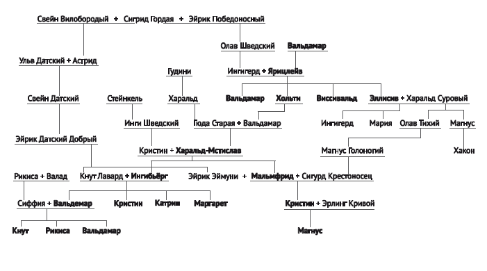 Из «Саги о Харальде Сигурдарсоне» мы знаем о четырех его детях – двух дочерях от Елизаветы Ярославны и двух сыновьях от Торы Торбергсдоттир (см. Главу 8, мотив 11). В трех редакциях саги, посвященной его сыну Олаву Тихому (1066–1093), ставшему правителем Норвегии после смерти отца, присутствует сюжет о том, как молодой норвежский король Олав распорядился судьбой своей сводной сестры Ингигерд: в 1068 г. он выдал ее замуж за Олава, сына короля Дании Свена Эстридсена (1047–1075/76), тем самым дополнительно укрепив норвежско-датский альянс, созданный браком его матери Торы Торбергсдоттир и Свена Эстридсена (см.: Adam. Lib. III. Cap. 53, 54, Schol. 84, 85).