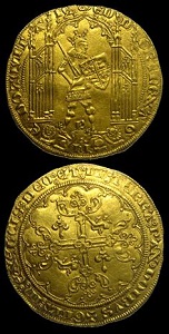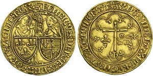 Монета: золотой салют (salute) Генриха VI, отчеканенный в Руане. Аверс: гербы Англии и Франции, над ними — сцена Благовещения, изображающая Деву Марию и ангела; реверс: простой крест с геральдической лилией и геральдическими львом, внизу — латинская буква Н
