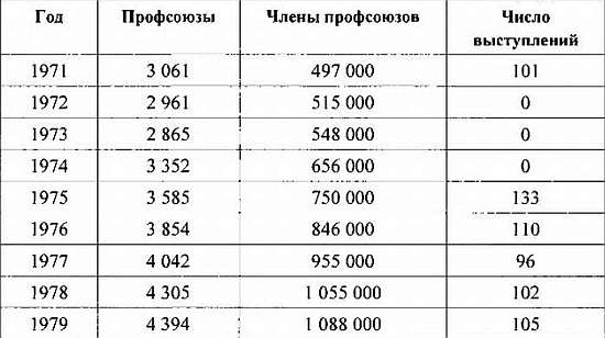 Активизация деятельности «демократических профсоюзов» способствовала активизации профсоюзного движения в стране в целом. Как видно из Таблицы 6, общее число членов профсоюзов выросло с 497 тысяч в 1970 г. до более 1 млн. в 1979 г., в то время как число местных отделений профсоюзов увеличилось с 3063 до 4394. В рассматриваемый период ежегодно в среднем происходило около 100 выступлений трудящихся, и хотя эта цифра на вид невелика, ее вполне достаточно, чтобы показать, что сопротивление рабочих не прекращалось и в условиях, когда по закону любые трудовые выступления были запрещены.
