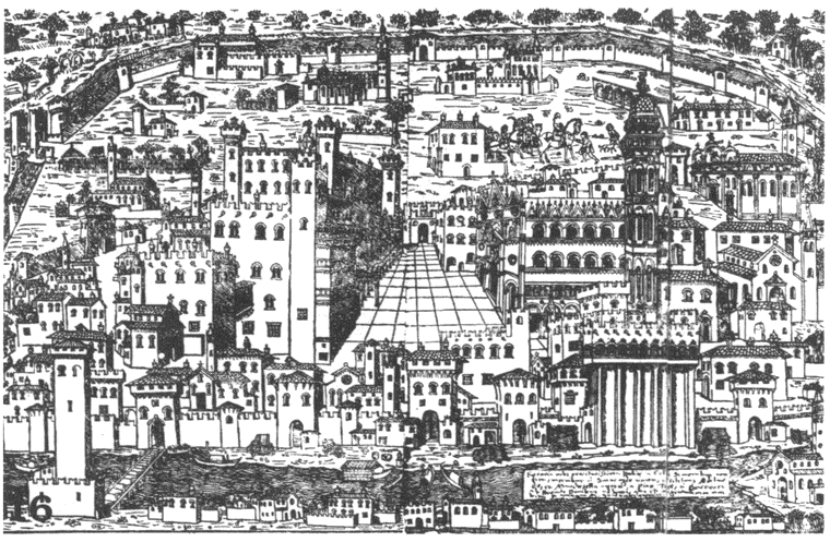 16. Гравюра конца XV столетия, изображающая Феррару.