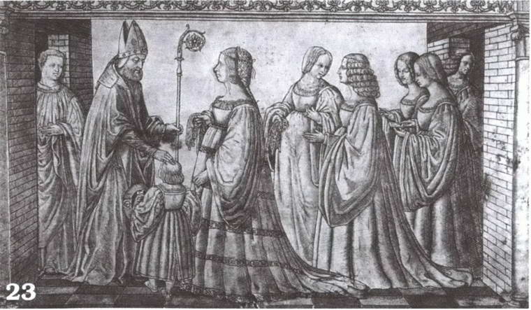 23. Гравюра на серебряной мемориальной доске изображает Лукрецию, ее сына Эрколе и святого покровителя Феррары Мурильо.
