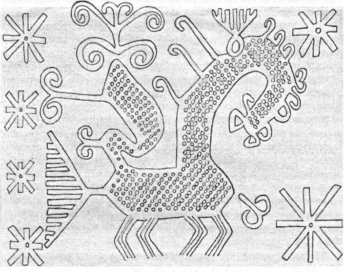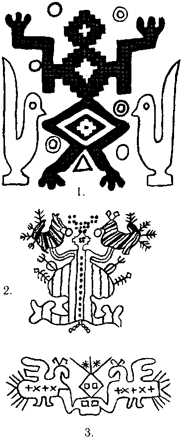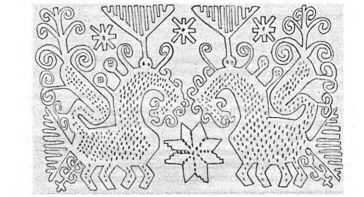 В Тарногских борушках — это помещенное между широко расставленными ногами первого существа, как правило, рогатого, второе, почти полностью аналогичное первому, рогатое существо, также в характерной распластанной позе. Первая фигура соединена со второй, меньшей, тонкой полоской — «пуповинкой». В северодвинских повойниках центральная фигура соединяется полоской, опускающейся также между широко расставленными ногами, с треугольником или трехступенчатой пирамидой. Но треугольник и ступенчатая пирамида в глубокой древности (в VI—III тыс. до н. э.) являлись знаком женского производящего начала, символом рождения и воспроизводства 38. Таким образом, ступенчатая пирамида и треугольник северодвинских кокошников — одно и то же со вторым «существом» композиций тарногских борушек.